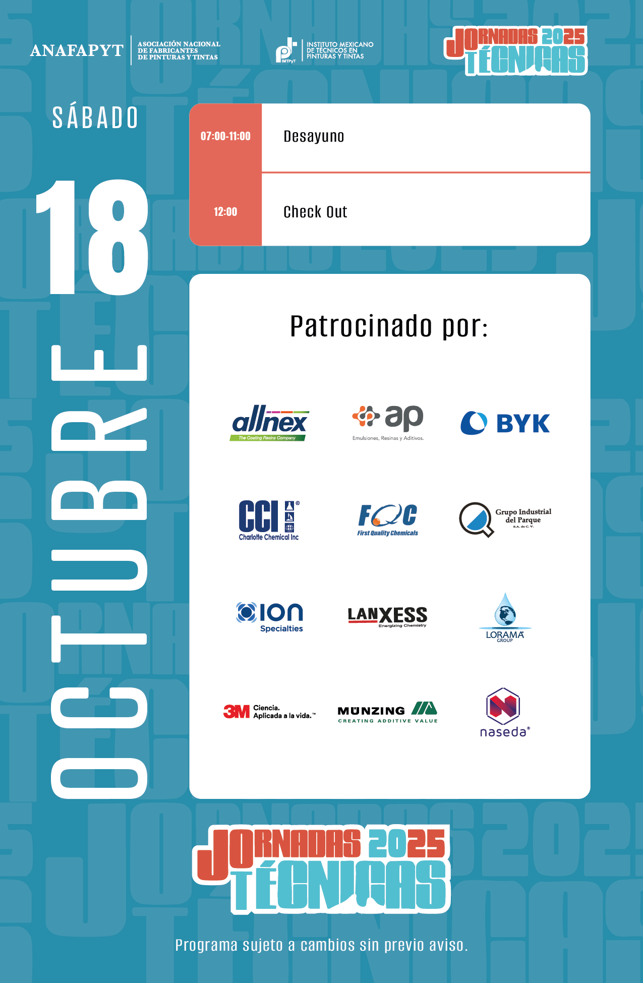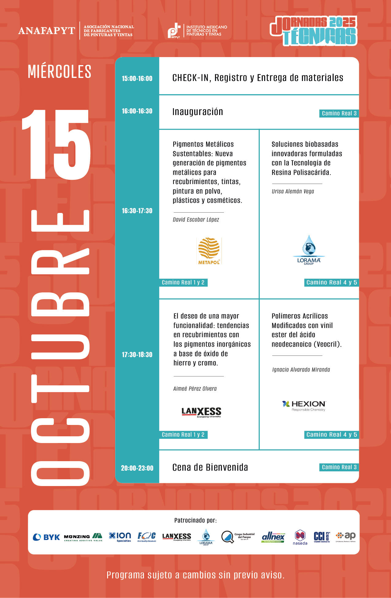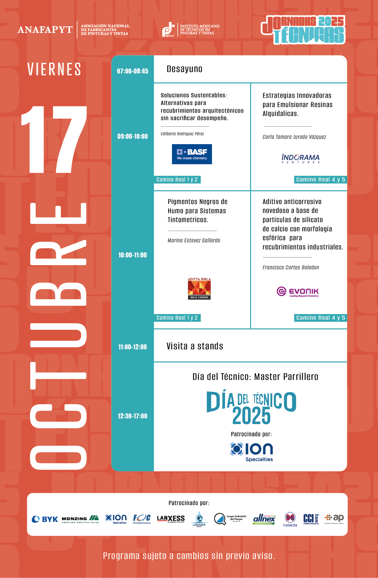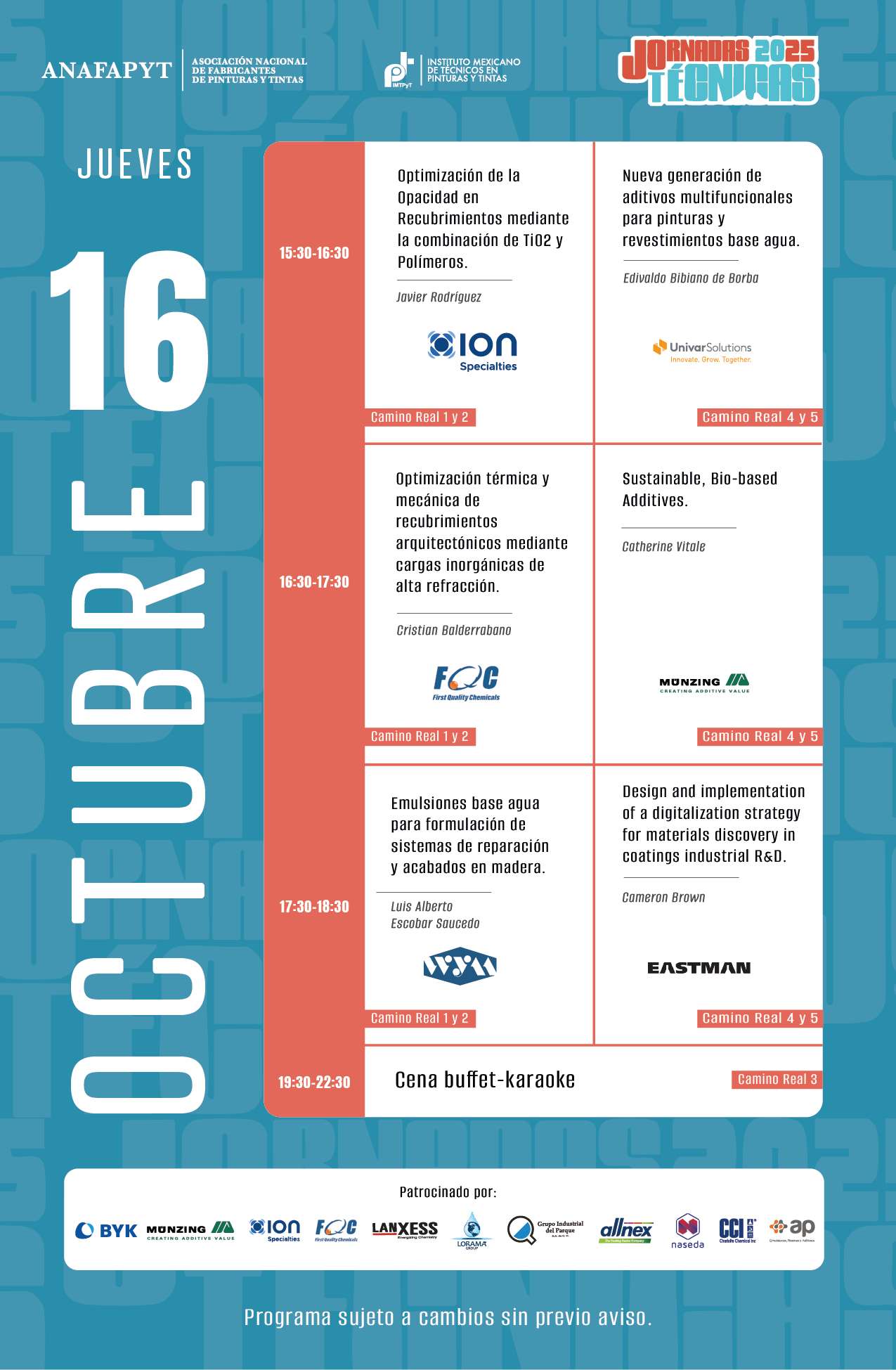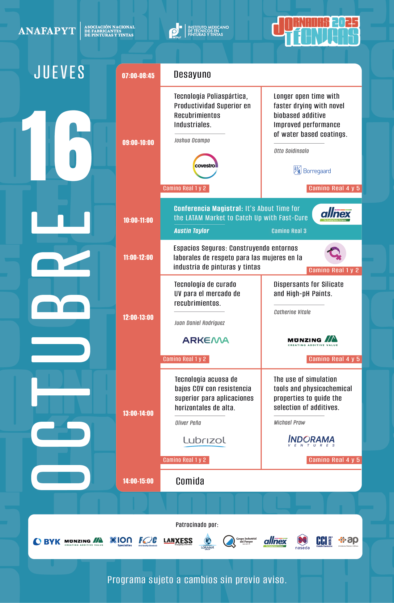 Las Jornadas Técnicas tienen como principal objetivo brindar a la industria, en su sentido más amplio, un espacio para presentar y compartir las últimas innovaciones científicas y tecnológicas en pinturas, recubrimientos y tintas. En esta edición, el programa se enfoca en incluir ejemplos del impacto que el desarrollo regulatorio global, con un enfoque en la sostenibilidad, está teniendo en los productos y procesos de nuestra industria.